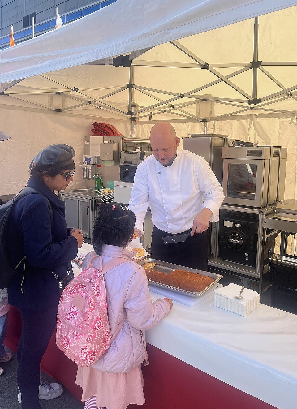 - Eine Feldküche, in der frisch gebackener Kuchen serviert wurde