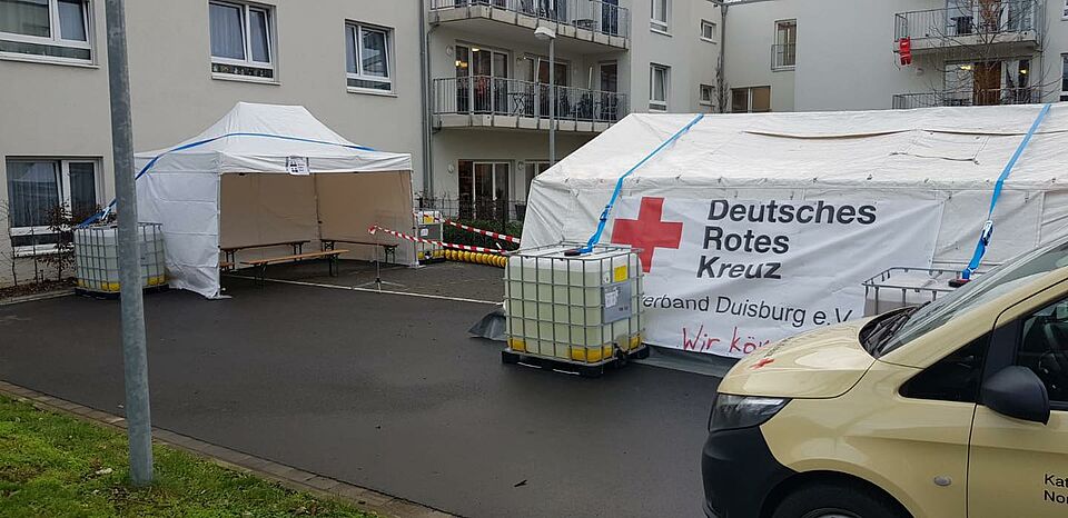 Auftrag ist das Einrichten und der Betrieb von Testzentren. Seit vergangenem Sonntag sind beide, vom DRK betriebenen Testzentren, in Betrieb und zwar am DRK-Seniorenzentrum, Gartenstraße 165 in Duisburg-Neumühl sowie am Malteserstift St. Johannes, Marienstraße 11 in Duisburg-Homberg.