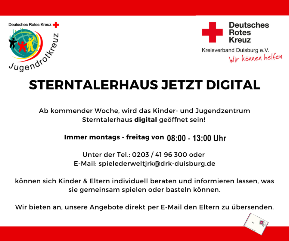 spielederweltjrk(at)drk-duisburg(dot)de können sich Kinder und Eltern informieren und individuell beraten lassen, was sie gemeinsam spielen, malen oder basteln können. Damit möchte das JRK helfen, die gemeinsame Zeit zuhause in der Familie kreativ und kurzweilig zu verbringen.
