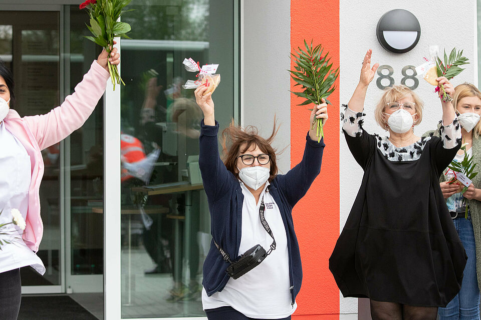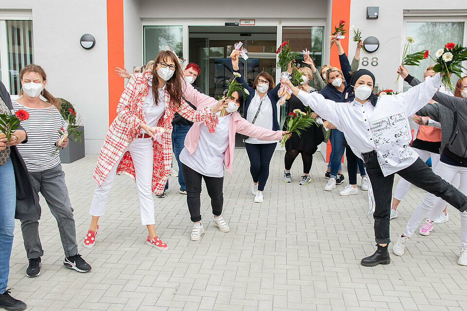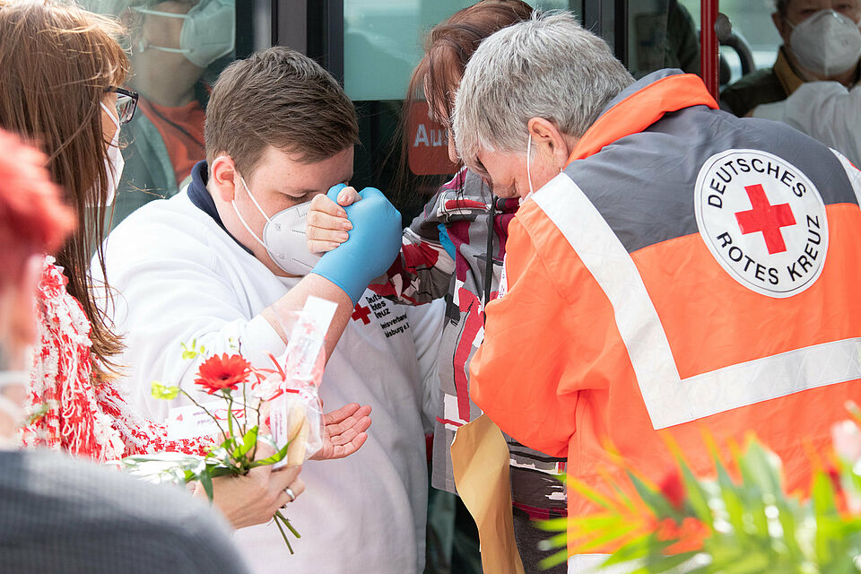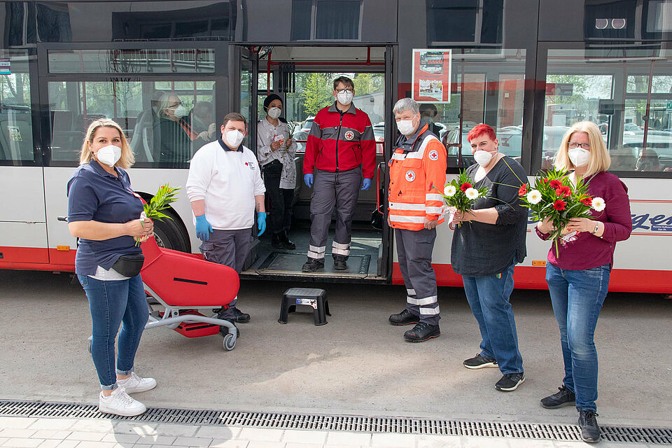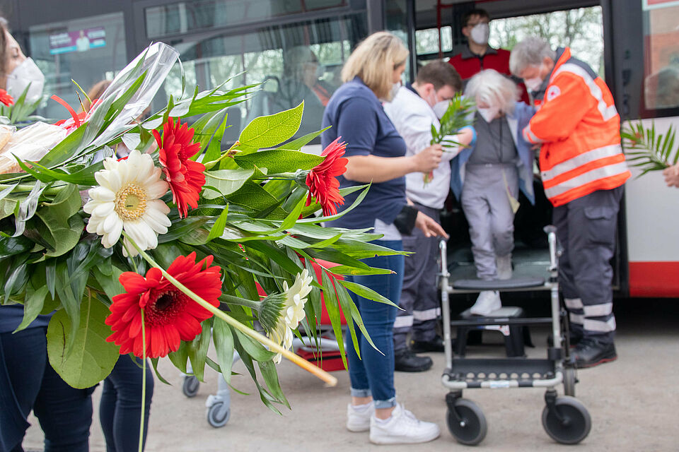 Mit Hilfe von 20 ehrenamtlichen Lebensretter des DRK-Duisburg konnten die, zum Teil bettlägerigen, die mobil eingeschränkten und auch die noch sehr rüstigen älteren Menschen mit Krankenwagen und extra gecharterten Bussen vom Stadtteil Neumühl in das etwa 12 Kilometer entfernte Hochfeld transportiert werden. Dort wurden Sie schon freudig von unseren großartigen Pflegekräften und der Einrichtungsleitung erwartet und mit liebevoll verpackten Geschenken und Blumen in Empfang genommen.