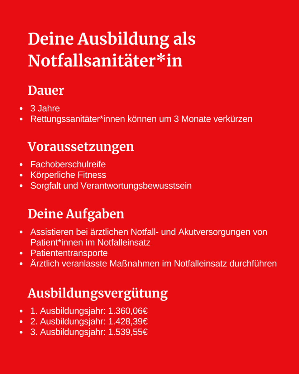 Die Ausbildung zum / zur Notfallsanitäter*in ist eine dreijährige Berufsausbildung die deutschlandweit durch das Notfallsanitätergesetz (NotSanG) geregelt ist. Der Notfallsanitäter ist die höchste nichtärztliche Qualifikation im Rettungsdienst.
